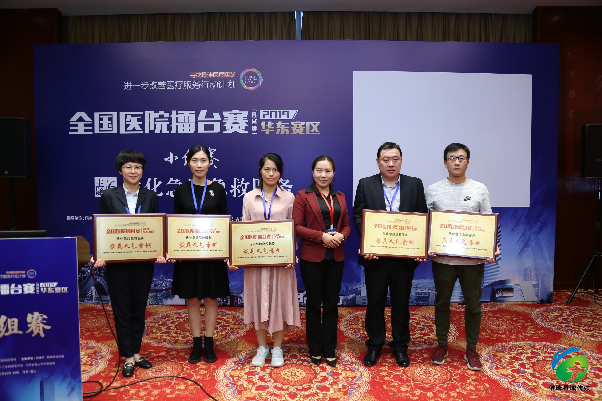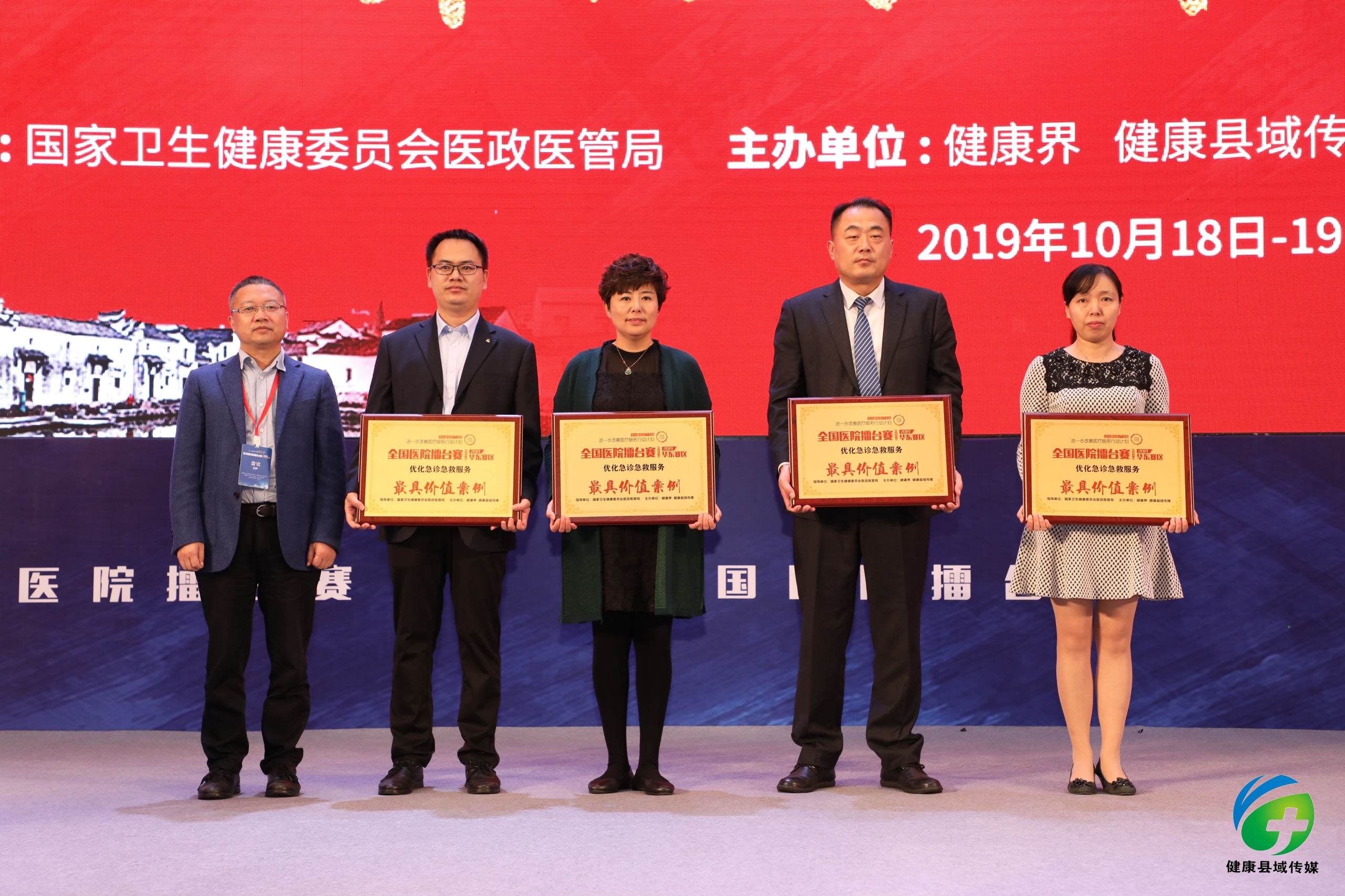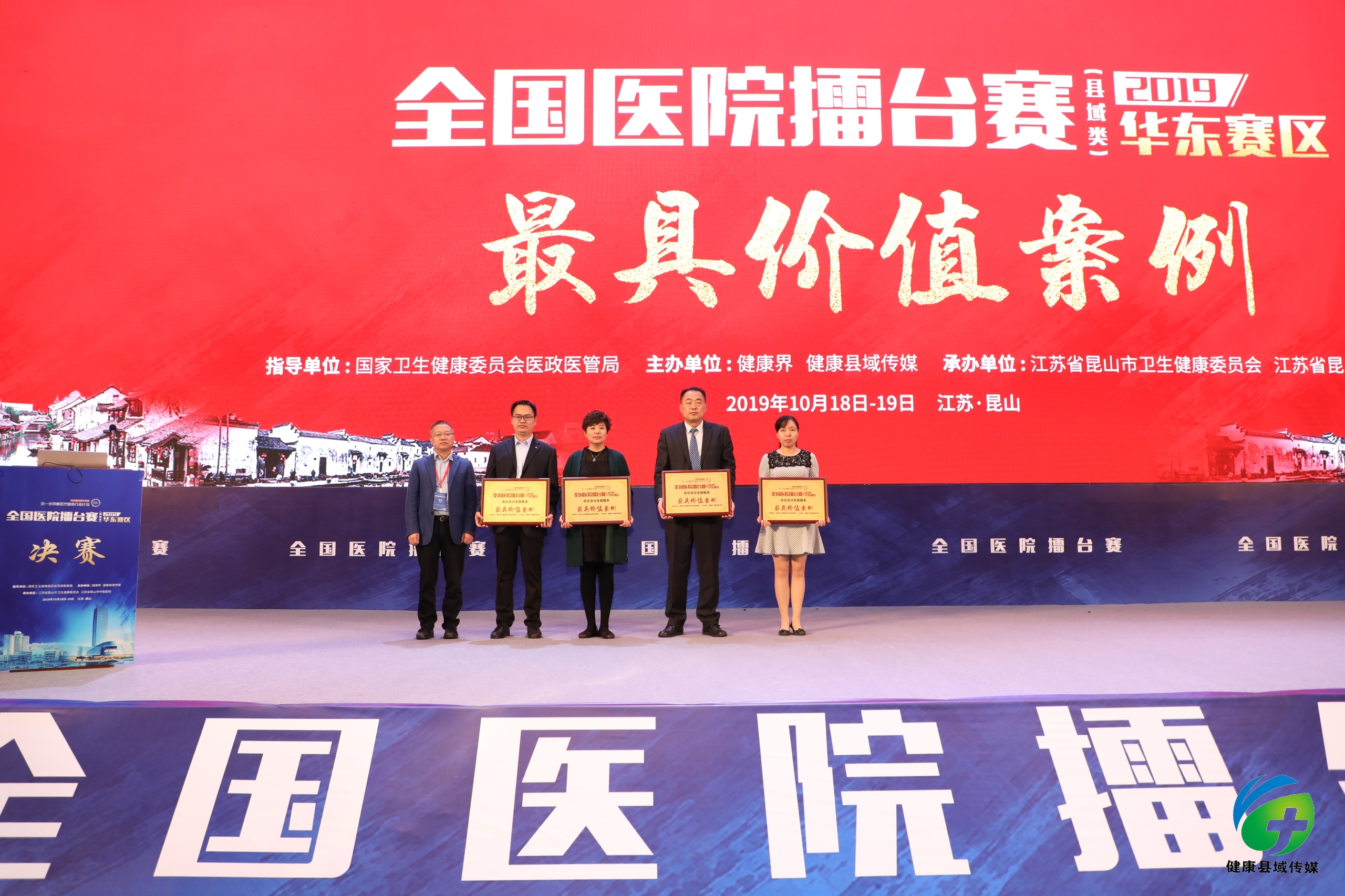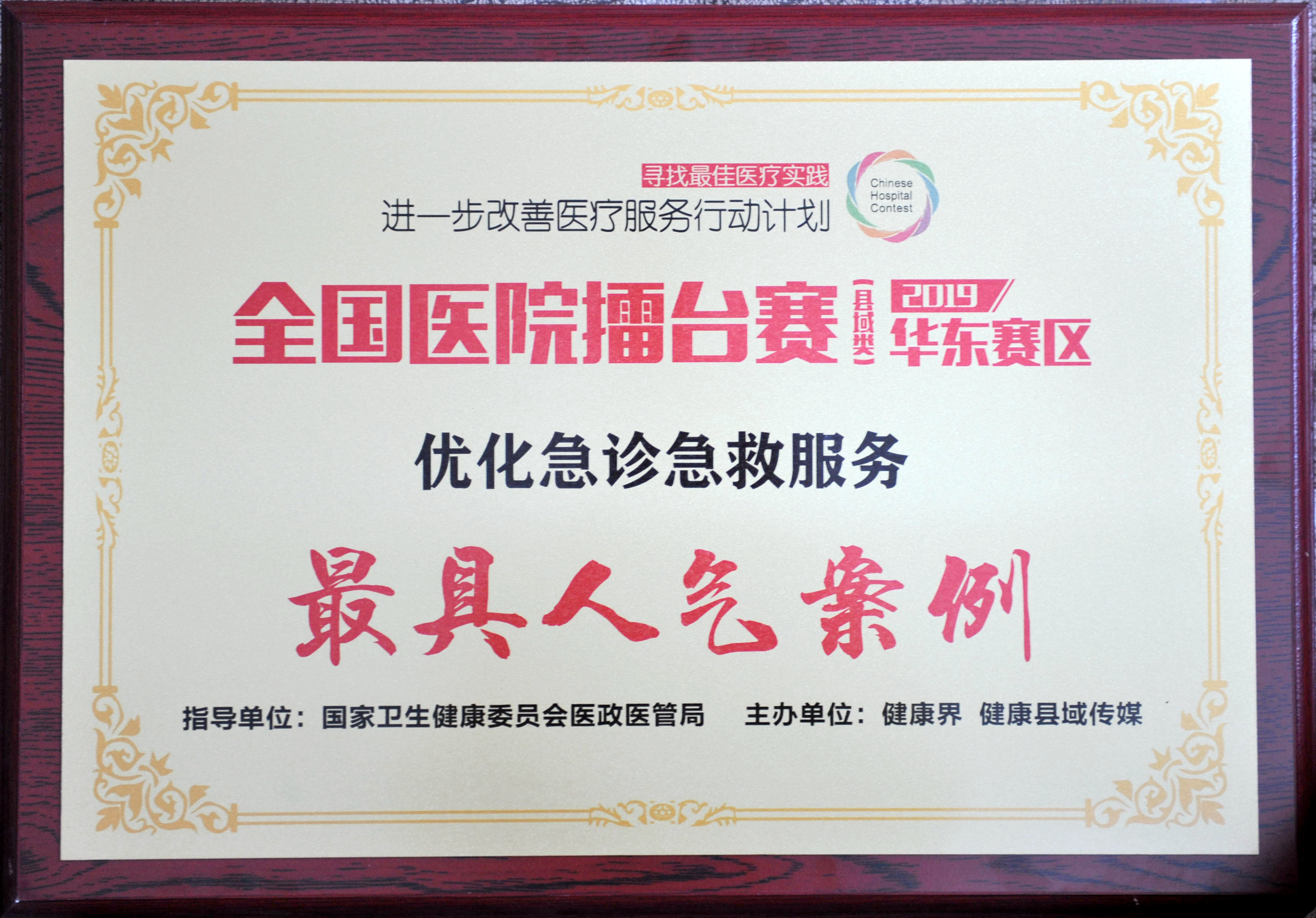 2019年10月18日-19日,由国家卫生健康委医政医管局指导,健康界、健康县域传媒主办的全国医院擂台赛(县域类)华东赛区决赛在江苏昆山落下帷幕。金乡县人民医院提交的《完善标准优化流程打造标准版中国胸痛中心》案例喜获“优化急诊急救服务”主题最具人气案例和最具价值案例两项殊荣。