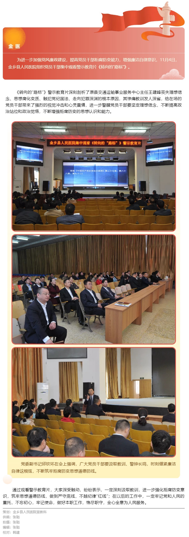 不忘初心 牢记使命 | 金乡县人民医院组织集中观看警示教育片《转向的“路标”》