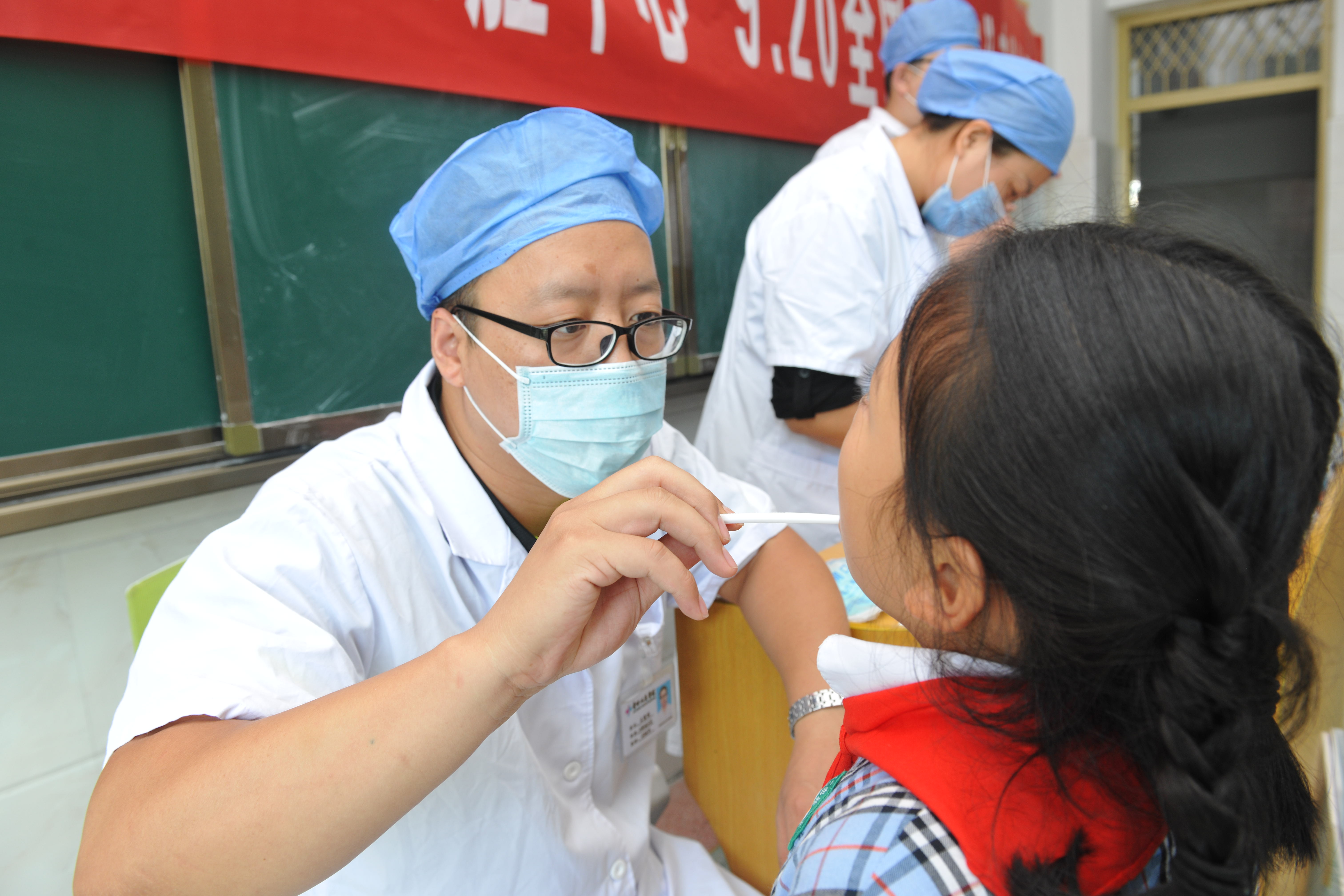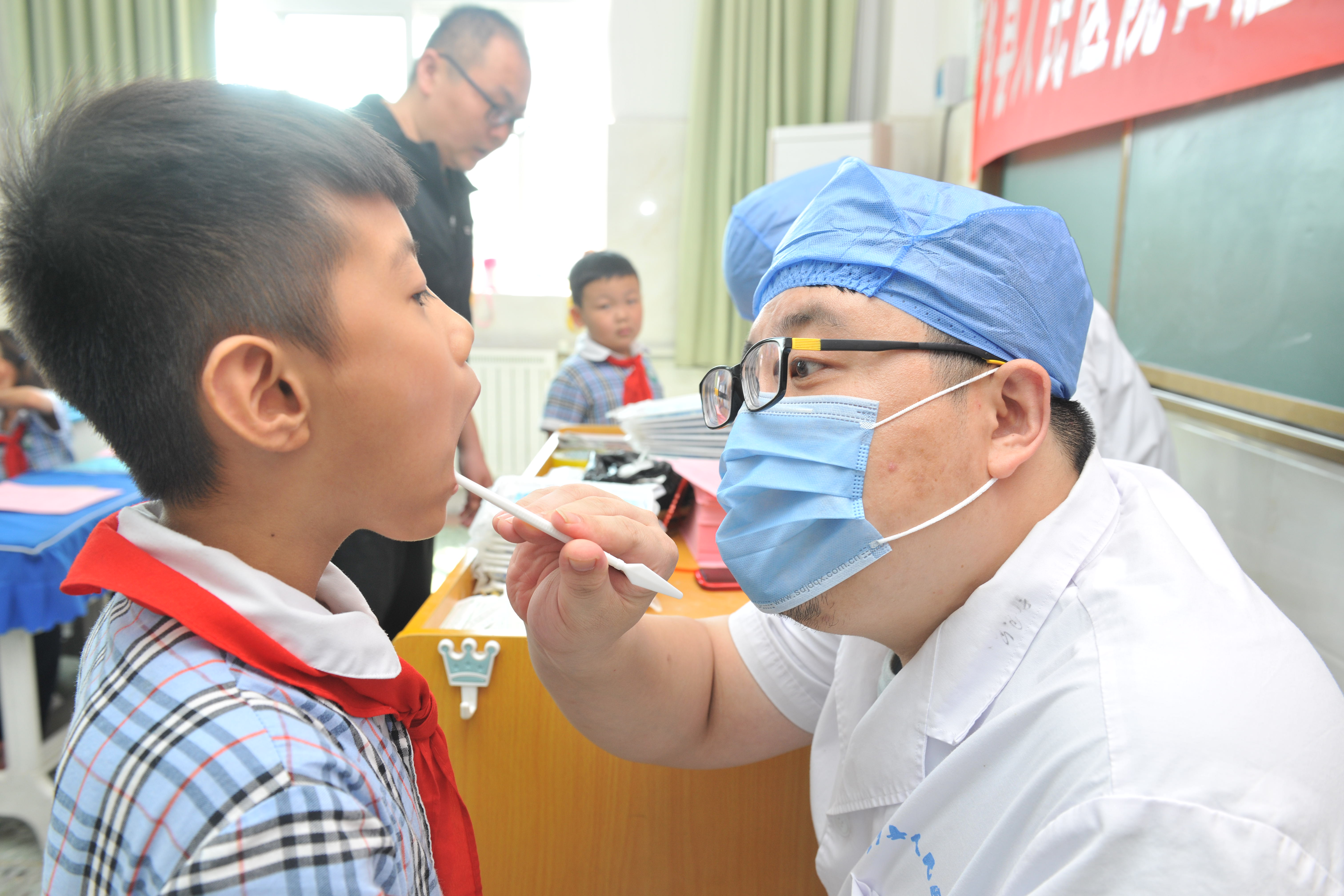 口腔中心王国栋、赵晨虎仔细为孩子们检查口腔
