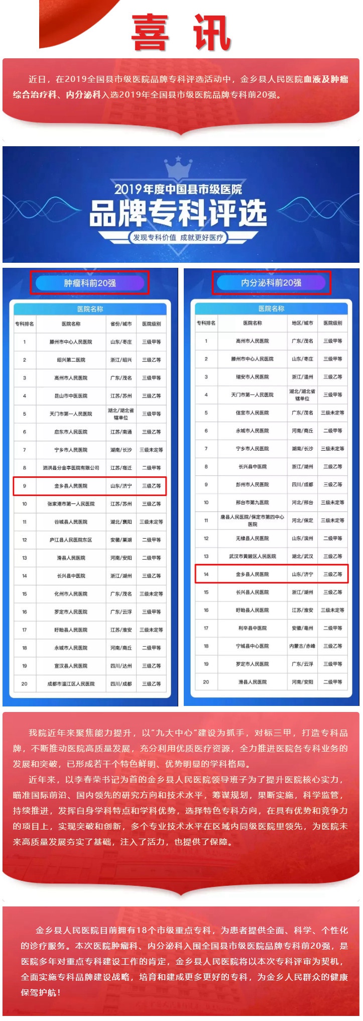【喜讯】金乡县人民医院两个专科上榜全国县市级医院品牌专科前20强