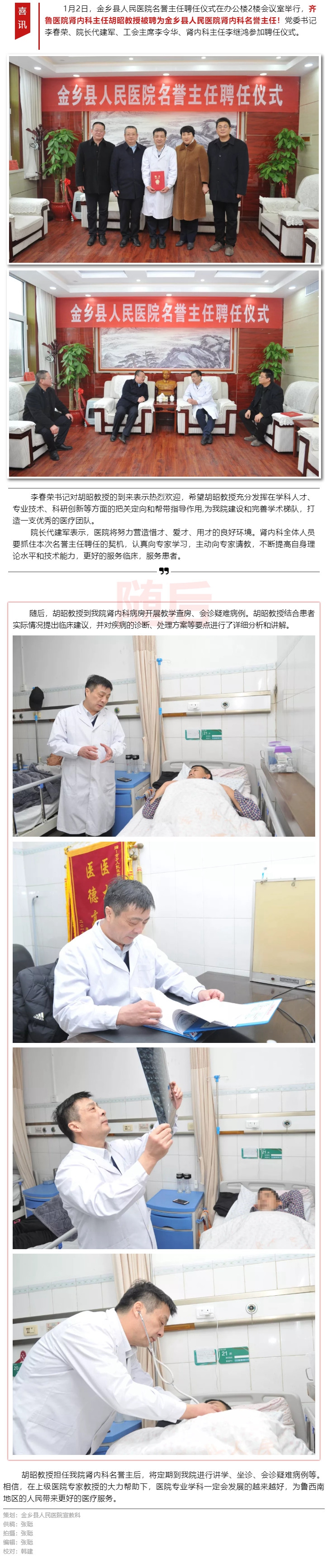 【喜讯】齐鲁医院胡昭教授被聘为金乡县人民医院肾内科名誉主任