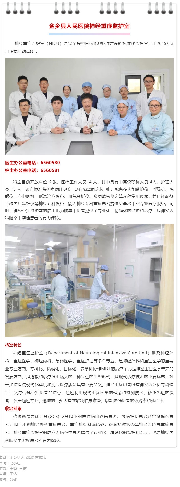 “我院神经重症监护室自2019年3月9日正式启动以来,已经收治280余例神经重症患者,对患者进行了专业高效的治疗。下一步,科室将依托医联体这一平台,通过远程会诊、技术指导、人才交流、学术会议等多种方式将上级医院专家、技术、救治经验等引进来,大幅提高对于神经重症患者的救治水平,使疑难危重病人得到更及时、有效的救治,进一步降低致死致残率,更好地造福金乡百姓。”神经重症监护室主任王魁说。