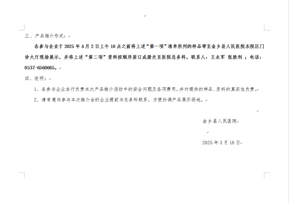 金乡县人民医院拟购置 治疗室地(吊)柜产品推介会
