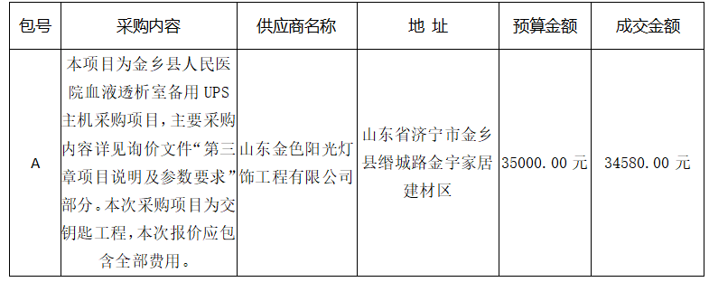 一.采购项目名称:金乡县人民医院血液透析室备用UPS主机采购项目